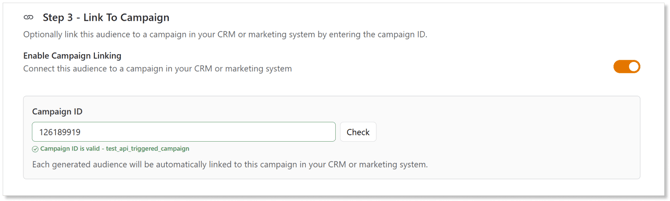 At step 3 (one-time audiences) or step 4 (real-time triggered audiences) enter the campaign ID noted from #1 and hit "Check". This will use the validate request to check the campaign exists in Xtremepush. If successful you will see the campaign name in the response