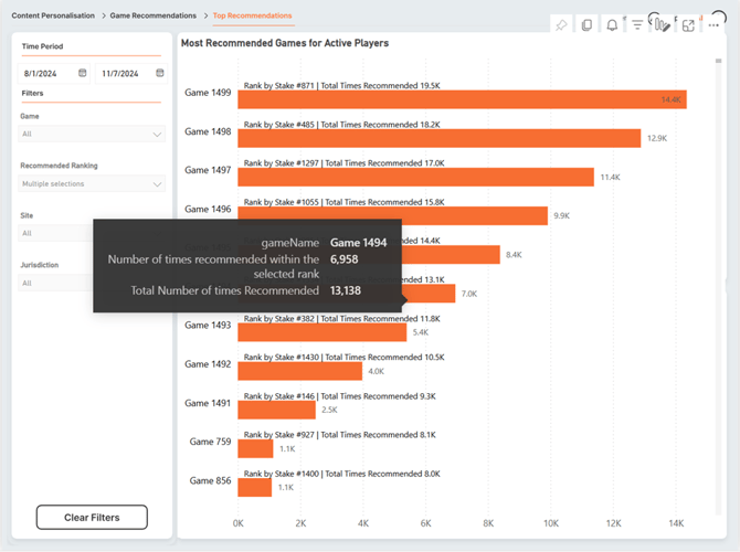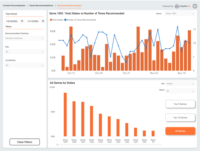 This Recommendations Impact dashboard provides a detailed view of how recommendation frequency correlates with player stakes for a specific game over a selected time period. By examining metrics like total stakes and recommendation count, operators can assess how effectively recommendations are driving player engagement, and make data-driven decisions to optimise future recommendations.