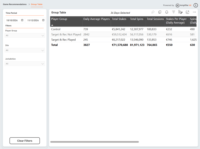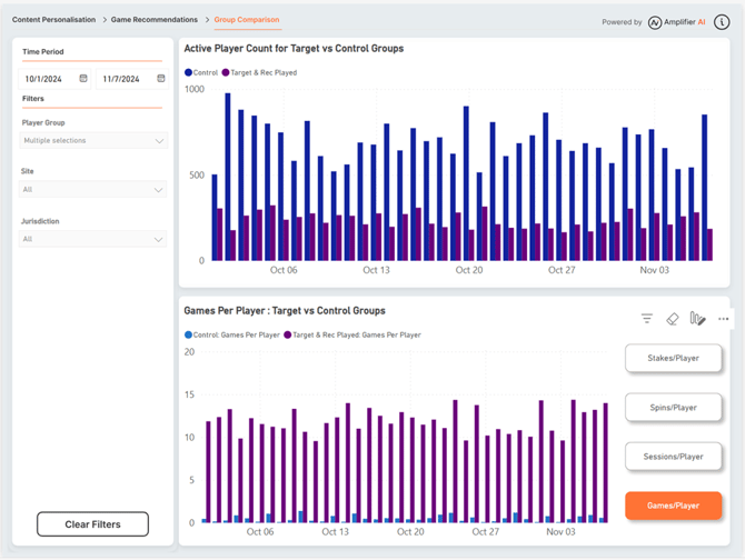 This dashboard provides a comparative analysis between target and control groups for game recommendations, allowing operators to evaluate the effectiveness of Amplifier AI recommendation engine.