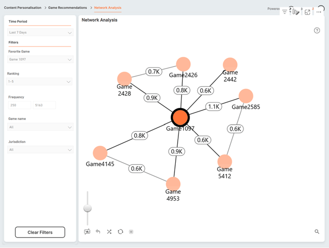 The Network Analysis graph provides insights into the relationship between recommended games. This visualization displays the connections between games frequently recommended to active players in the last 7 days, helping operators identify clusters of games with shared player interest and recommendation overlap.
